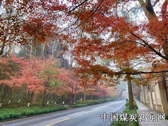 冬寒秋色枫叶红,翠盈晓雾绿葱葱