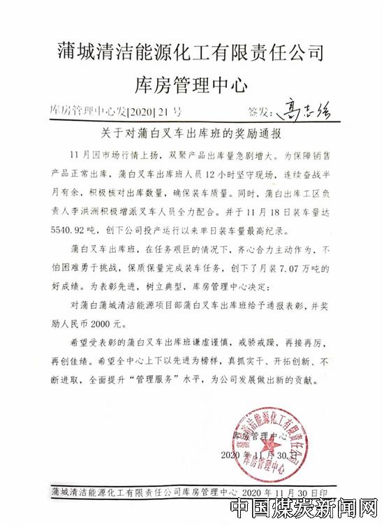 【本网讯】“蒲白项目部出库班,在任务艰巨的情况下,齐心协力、主动作为、不怕困难、勇于挑战,保质保量完成了装车任务,11月18日装车量达5540.92吨,创下了公司投产运行以来装车辆最高纪录!谢谢了!蒲白的兄弟们了!”这是陕煤蒲城清洁能源公司发给煤化运营公司清能项目部的奖励通报。
