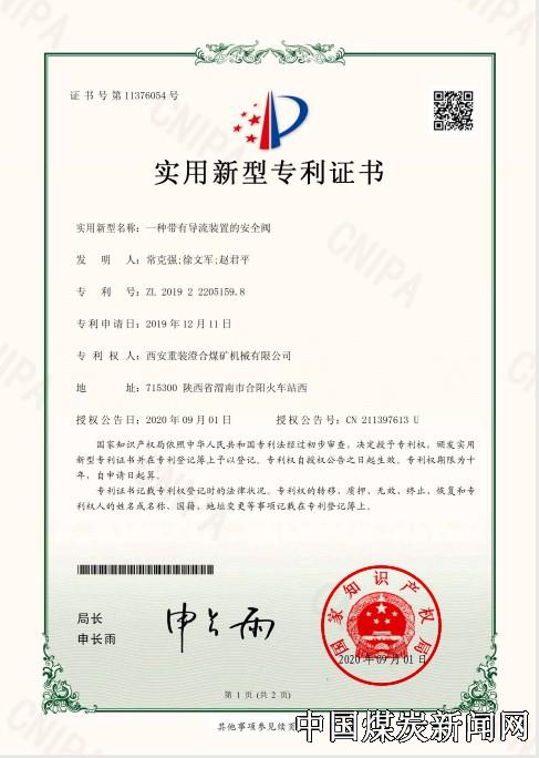 ![]() “一种矿用高强度圆环链连续热处理淬火液喷射圈装置”国家实用新型专利通过喷射圈水幕式全方位喷出流速可调的淬火液,使淬火液喷射链条加热和冷却均匀,有效增强链环淬火的稳定性和淬透性,大幅度提高链条的抗拉强度和使用寿命。“一种带有导流装置的安全阀”实用新型技术涉及矿用综采液压支架中的液压阀乳化液防泄漏技术领域,通过在安全阀本体溢流孔外部增加导流装置,解决了液压支架在卸载时的乳化液因为外流对地下水资源造成污染,实现了拆卸清理和维护快捷省力,降低了成本投资,提高煤机装备安全使用寿命。两项专利分别于2020年6月16日和2020年9月1日授权公告,技术创新成果在推广应用中,为公司创造了良好的经济效益。