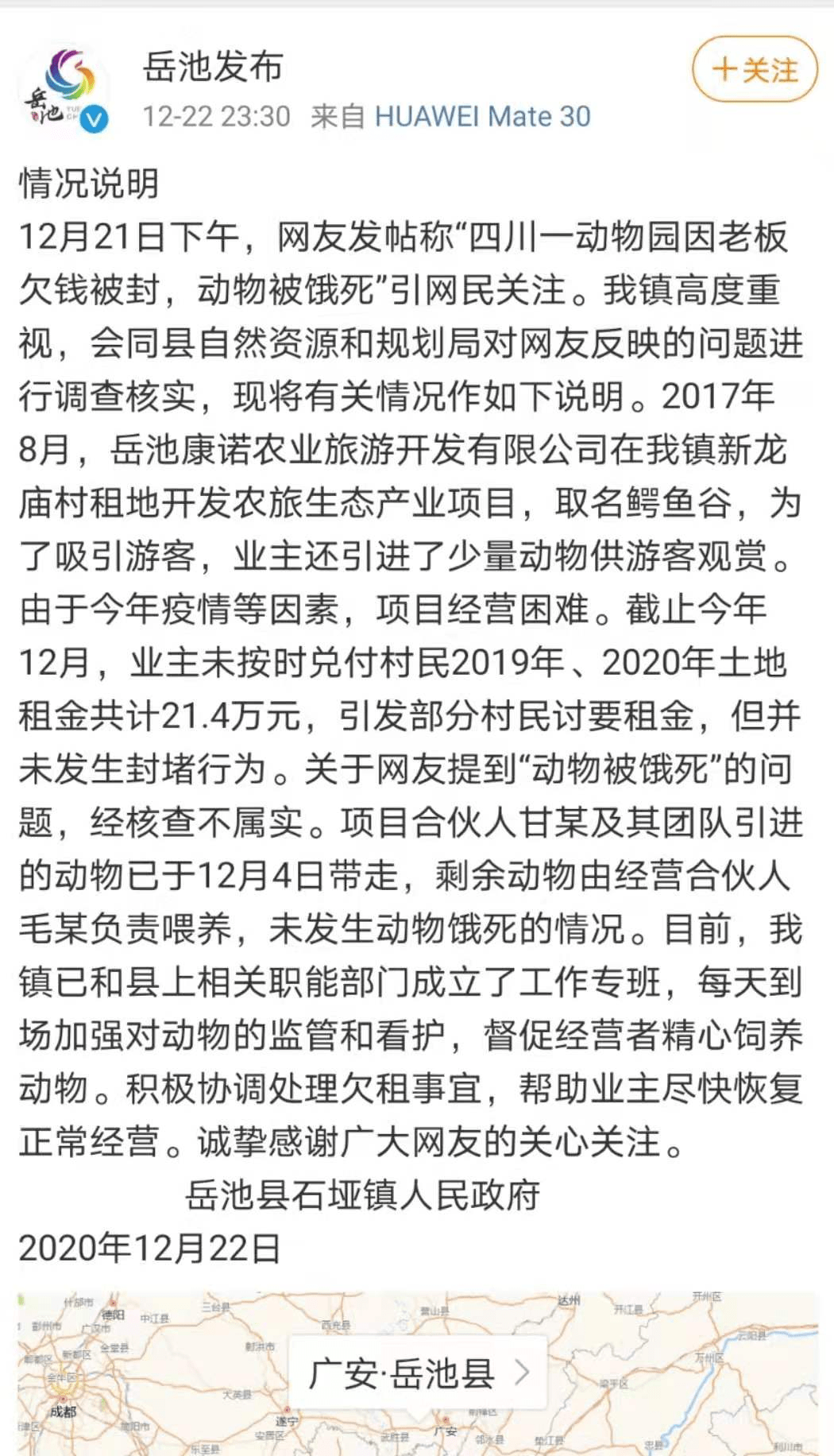 以下是情况说明全文: 12月21日下午,网友发帖称“四川一动物园因老板欠钱被封,动物被饿死”引网民关注。我镇高度重视,会同县自然资源和规划局对网友反映的问题进行调查核实,现将有关情况作如下说明。 2017年8月,岳池康诺农业旅游开发有限公司在我镇新龙庙村租地开发农旅生态产业项目,取名鳄鱼谷,为了吸引游客,业主还引进了少量动物供游客观赏。 由于今年疫情等因素,项目经营困难。截止今年12月,业主未按时兑付村民2019年、2020年土地租金共计21.4万元,引发部分村民讨要租金,但并未发生封堵行为。 关于网友提到“动物被饿死”的问题,经核查不属实。项目合伙人甘某及其团队引进的动物已于12月4日带走,剩余动物由经营合伙人毛某负责喂养,未发生动物饿死的情况。 目前,我镇已和县上相关职能部门成立了工作专班,每天到场加强对动物的监管和看护,督促经营者精心饲养动物。积极协调处理欠租事宜,帮助业主尽快恢复正常经营。 诚挚感谢广大网友的关心关注。 岳池县石垭镇人民政府 2020年12月22日