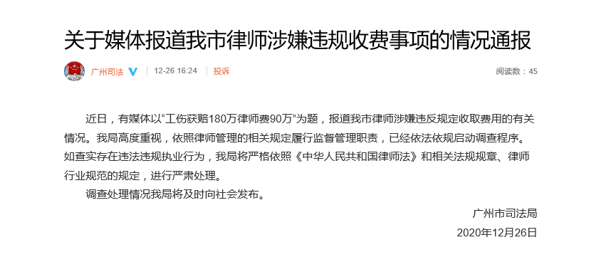 | 媒体报道“工伤获赔180万律师费90万” 广州市司法局调查 | |||