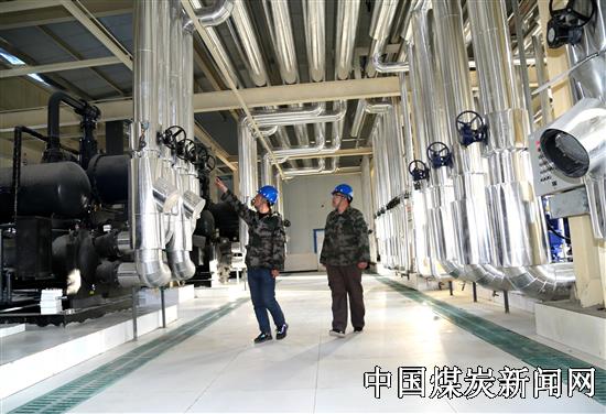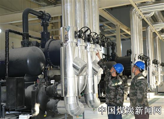 【本网讯】随着科技进步和节能减排意识的增强,晋能控股煤业集团塔山煤矿今年利用供暖新设备对该矿一盘区风井井下供热系统采取了颠覆性的供热方式,由乏风余热供热系统组成的热泵正式替代燃煤锅炉上岗,实现了“产煤不烧煤,绿色能源供热”。的供暖新时代。图为工作人员在整洁干净的机房内进行安全巡检。