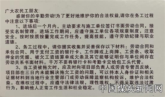 ![]() 该项目部自进场以来,第一时间成立了农民工工资管理领导小组,建立相应发放台账,有效规范了农民工工资发放工作。同时,项目部还利用多种方式,多次组织各类活动对《保障农民工工资支付条例》等相关文件精神进行宣贯学习,确保项目管理者从思想上认识到规范支付农民工工资工作的重要性。此外,针对农民工朋友法律意识淡薄、维权意识不强等现状,项目部抓住即将到来的春节返乡时机,为农民工朋友逐一送去“维权联系卡”,该卡片包含了劳务专员相关信息和维权信息内容,有效的确保了举报投诉渠道的畅通。 “维权联系卡”的制作和发放,进一步保障了农民工维权渠道的畅通,为项目稳健发展提供了良好的劳务用工保障。