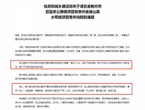 10月,住建部网站发布《关于湖北省荆州市巨型关公雕像项目和贵州省独山县水司楼项目有关问题的通报》(下文简称“通报”)。 通报称,“湖北省荆州市在古城历史城区范围内建设的巨型关公雕像,高达57.3米,违反了经批准的《荆州历史文化名城保护规划》有关规定,破坏了古城风貌和历史文脉”。 鉴于此,住建部要求湖北省住房和城乡建设厅结合职责配合有关部门跟踪指导荆州市做好巨型关公雕像项目整改;要举一反三,加强监管,完善制度,发现苗头问题及时干预、纠正,坚决杜绝滥建“文化地标”等形象工程、政绩工程。 但并未对整改方向给出具体要求。