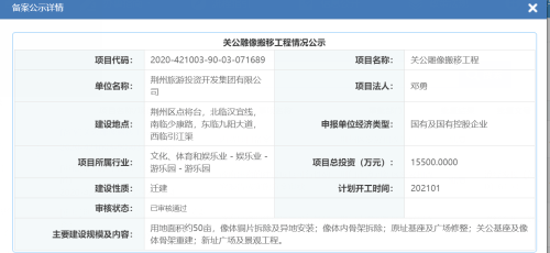 而今天(12月30日),“关公雕像搬移工程斥资1.55亿元”再度引发关注。 据湖北省投资项目在线审批监管平台显示,荆州区发展和改革局12月17日批复的“关公雕像搬移工程”已审核通过,项目总投资为15500万元,计划开工时间为2021年1月。 该工程主要建设规模及内容包括:雕像用地面积约50亩,像体铜片拆除及异地安装;像体内骨架拆除;原址基座及广场修整;关公基座及像体骨架重建;新址广场及景观工程。