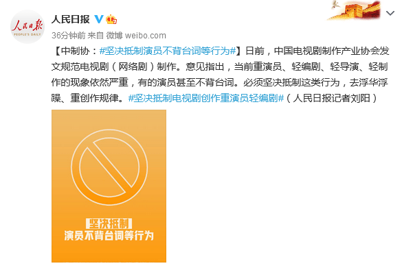 【中制协:#坚决抵制演员不背台词等行为#】日前,中国电视剧制作产业协会发文规范电视剧(网络剧)制作。意见指出,当前重演员、轻编剧、轻导演、轻制作的现象依然严重,有的演员甚至不背台词。必须坚决抵制这类行为,去浮华浮躁、重创作规律。#坚决抵制电视剧创作重演员轻编剧#(人民日报记者刘阳)