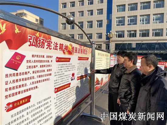 【本网讯】12月4日,山西华阳新材料科技集团二矿开展了国家宪法日宣传活动,通过宣传牌板、发放宣传资料、现场讲解政策法规等方式,进一步传递法治力量,增强职工的宪法意识。图为职工正在学习宪法知识。
