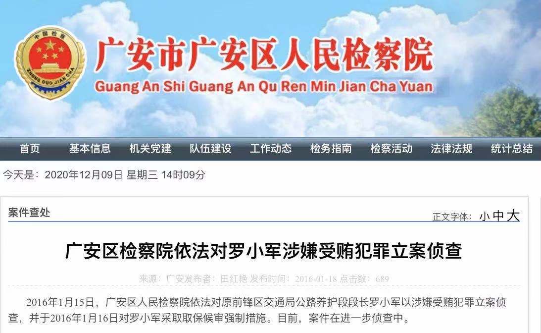 ▲广安市广安区人民检察院官网截图。 最近几天,曾挂任四川广安市前锋交通建设投资开发有限公司总经理职务的罗小军备受网友关注。有网友发现,罗小军此前系原广安市前锋区交通局公路养护段段长,2016年曾因涉嫌受贿犯罪被广安市广安区人民检察院立案侦查。 此事被网友曝光后,12月5日,广安鑫鸿集团有限公司回复称,根据罗小军本人意愿和工作需要,正按程序免去其挂任的广安前锋交通建设投资开发有限公司总经理职务,已不在企业工作。对于罗小军在2016年曾因涉嫌受贿犯罪被立案侦查一事的后续情况,12月8日,红星新闻记者曾联系广安市广安区人民检察院政治部,相关负责人表示目前不便接受采访。 2016年1月18日,广安市广安区人民检察院官网曾发布“依法对罗小军涉嫌受贿犯罪立案侦查”消息,其中披露,原前锋区交通局公路养护段段长罗小军以涉嫌受贿犯罪立案侦查,并被取保候审强制措施。 要厘清的是,公职人员被立案侦查,不等于罪名成立,也不等于定罪量刑。如果最终查明不构成犯罪,并且也未受到纪律处分,那他的升迁应该不受影响。即便受到处分,在过了影响期后,也可以依规依程序提拔。 如《中国共产党纪律处分条例》中规定,党员受到警告处分一年内、受到严重警告处分一年半内,不得在党内提升职务和向党外组织推荐担任高于其原任职务的党外职务。反过来看,过了规定所明确的限制期后,受到处分的公职人员获得升迁,并不能等于是“带病提拔”。 但此事的蹊跷在于,人都复出2年了,关于罗小军被立案调查的后续,却至今未有明确的公开消息。正常来说,针对公职人员的立案调查,结果到底如何,理当依照程序公开。即便涉嫌的罪名不成立,也应该公开还人清白。只发布立案调查公告,却无下文公示,哪怕不涉及后续提拔,也难免给人案件处置“烂尾”的观感。 罗某担任新职的鑫鸿集团,在回应中只是强调了其个人能力,而并未直接证明程序是否合规,更未解释清楚,从被立案调查,到时隔四年后再度升迁,罗的个人经历是否符合相关规定。 毕竟,用人要看能力,但也得建立在程序公正的基础上。只强调个人能力,而忽视程序正义,是说不过去的。当然,这方面的解释责任,可能并不完全在这家地方国企,但是舆情发酵之下,相关部门显然不能失语。 此外,从回应可以看到,目前鑫鸿集团正按程序免去罗挂任的总经理职务。舆论一质疑就立马免职,可能是迫于舆论压力为之。如果只是应对舆论的危机公关,那也不妨给出更详细的说明;若是程序上确实有瑕疵,免职恐怕无法为此事画上句号,更要追究违规任免的责任。 此事其实并不复杂。如果罗的升迁,完全是在程序范围内,就应该大大方方给他一个清白;如果存在问题,就理应彻查到底。目前最重要的是,罗被立案调查的结果到底是什么,从被调查到在国企复出并升迁,这期间到底发生了什么?这些问号,不仅关系到罗某个人复出的正当性,也攸关党纪国法的严肃性,容不得“含糊”。 □重舟(媒体人)