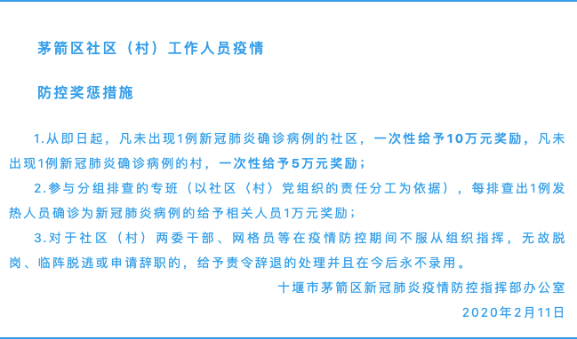 据《楚天都市报》报道,2月11日,湖北省十堰市茅箭区出台重奖措施: 从即日起,凡未出现1例新冠肺炎确诊病例的社区,一次性奖励10万元,未出现1例新冠肺炎确诊病例的村,一次性奖励5万元; 每排查出1例发热人员确诊为新冠肺炎病例的给予相关人员1万元奖励。 政知见(微信ID:bqzhengzhiju)注意到,数据显示,截至2月11日24时,湖北全省新型冠状肺炎累计死亡1068例,十堰市1例、病死率0.19%,全省最低。 而在十堰市,茅箭区已确诊181例,是该市确诊病例最多的地方。 重奖社区做好防控工作 十堰在湖北有特殊的地理位置。武汉有“九省通衢”之称,十堰则是“川陕咽喉、四省通衢”之地。 它位于湖北省西北部,汉江中上游,与河南西部、陕西南部、重庆东部等3省市边境交界,是鄂、豫、陕、渝毗邻地区唯一的区域性中心城市。 在这样一个地方,“早发现、早报告、早隔离、早治疗”的重要性不言而喻。 政知见(微信ID:bqzhengzhiju)搜索了一下新闻报道,基层排查出病例给予现金奖励,十堰这样的做法在全国尚属首次。 早在2月8日,十堰市房县发布了《发热病人就诊奖励办法公告》。公告中也提到,凡乡镇、村、组干部(含工作队、村医)排查发现核实1例发热人员的,奖励500元。 此外,房县还规定从2月9日至2月18日,凡发热人员主动到县乡定点医院就诊的,奖励1000元。 房县卫生健康局局长卢启辉在接受采访时介绍,2月9日当天就有48名发热患者去医院就诊。 卢启辉表示,在发布奖励办法之前,房县一直按照“网格化”的方式,组织县乡村干部及驻村干部进行逐户排查。但这需要较多的时间,不能在第一时间发现病患,希望通过奖励办法,来确定重点人群,切断传染源,最大限度地对疑似病例进行收治。 十堰市茅箭区则开出了更高的奖励金额。 该区新冠肺炎疫情防控指挥部相关负责人在接受记者采访时介绍,这样做的目的就是为了尽最大可能发挥社区(村)两委干部、网格员的积极性,管好居民,不让居民乱跑,尽快控制疫情。 防控一线工作压力、心理压力大 为什么要重奖社区的防控工作? 首先,在疫情整体防控工作中,人口密集的社区是关键一步。 一方面,春节假期,大量人员返乡,社区已感染患者存量不少。另一方面,因为人口密集且流动性大,社区还面临着新增感染风险的压力。 政知见(微信ID:bqzhengzhiju)注意到,湖北全省住宅小区已经实行了封闭管理。 2月10日,湖北省住建厅发出《关于印发〈湖北省住宅小区、办公建筑新型冠状病毒肺炎疫情防控工作指南〉的通知》。 该通知指出,住宅小区要实行封闭管理,原则上只保留一个出入口,人员进出必须测量体温并登记,严禁体温超过37.3℃的来访人员出入;暂时关闭小区内会所、图书馆、活动室等人员聚集场所,限制非本小区人员及车辆进入住宅小区(包括快递员、外卖员等)。 目前,武汉多个区和湖北省多个地市已经发布公告,在居民住宅小区,每户家庭每3天可指派1名家庭成员凭《居民出入卡》出门采购生活物资。 其次,基层工作不易,防控一线的社区工作人员无论是工作压力还是心理压力都很大。 2月10日,民政部基层政权建设和社区治理司司长陈越良在国务院联防联控机制新闻发布会上表示,疫情发生以来,近400万名城乡社区工作者奋战在65万个城乡社区的疫情防控一线,平均6个社区工作者守护着一个社区,每名社区工作者面对350名群众,任务异常繁重,工作十分辛苦。 陈越良说,从近日各地的新闻报道中可以看到,有的社区工作者身怀六甲仍战斗在一线,有的亲人去世都没有请一天假。他们担当着社区工作者的职责和使命,为遏制疫情扩散蔓延作出了重要贡献。中国科学院心理研究所副所长陈雪峰建议,基层政府要做好疫情抗击一线的社区工作人员的物资保障,还要多关注社区工作人员的家庭生活情况,让他们能够踏踏实实投入到前线抗击疫情。 落实“应收尽收”的关键 当然,阻断疫情传播源,社区防控是落实“应收尽收”的关键。 2月8日,中央指导组副组长陈一新在武汉各区区委书记、区长组成的微信工作群里,对“应收尽收”的重要性给出了一个形象的比喻: “水龙头不关,拖地板再起劲也是徒劳。” “应收尽收”更是中央对湖北的要求。 2月8日,央视报道称,连日来,孙春兰指导督导湖北省、武汉市刻不容缓依法采取果断措施,不折不扣落实“四类人员”分类集中管理措施,真正做到应收尽收、不漏一人。 2月11日,孙春兰率中央指导组来到武汉市武昌区南湖街隔离观察点和新改建为“方舱医院”的武汉体育馆、武汉博览中心,实地了解应收尽收落实情况。 多日以来,《湖北日报》、《长江日报》都报道了不少社区工作人员落实“应收尽收”的故事,其中不乏帮助确诊病人联系医院,劝说轻症病人住进放舱医院案例。 △在武汉东湖高新技术开发区智苑社区,工作人员不间断地用“小喇叭”开展防控宣传 2月6日,武汉市江汉区一位环卫工人李阿姨确诊。社区干部去走访发现,李阿姨和丈夫刘先生住在一间十来平方米的房子里,非常拥挤。幸好,刘先生并未感染。但是,夫妻俩住在一起极易交叉感染。 经过社区上报,江汉区方舱医院为李阿姨留了床位,通知她准备生活用品前去入住。可是李阿姨坚决不肯,认为去方舱医院更容易交叉感染。社区干部上门劝说,李阿姨仍然不肯,错过当天方舱医院名额。 2月8日,社区专门请人拍了一小段方舱医院病