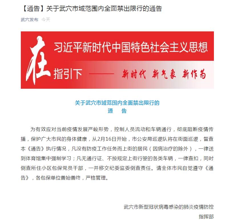 湖北黄冈武穴市15日发布通告:从2月16日开始,市公安局巡逻队将在街面巡逻,督查本《通告》执行情况,凡没有防疫工作任务而上街的居民(因病治疗的除外),一律送到体育馆集中强制学习;凡无通行证、不按规定上街行驶的各类车辆,一律查扣,同时倒查所住小区包保党员干部,一并移交纪委监委倒查责任。请全体市民自觉遵守《通告》,各包保单位善始善终,严格管理。