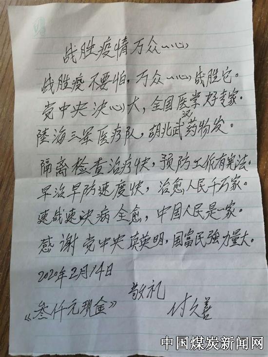 ![]() 问及他时他为什么要进行此次捐款。他说到本次疫情十分严峻,但是他相信党,相信政府,相信所有奋战在“疫”线的人员能打赢此次疫情攻坚战,人民生活更加幸福美满。他也想和一线人员并肩作战,但是自己年岁已高,只能通过这种方式与一线工作人员共进退。