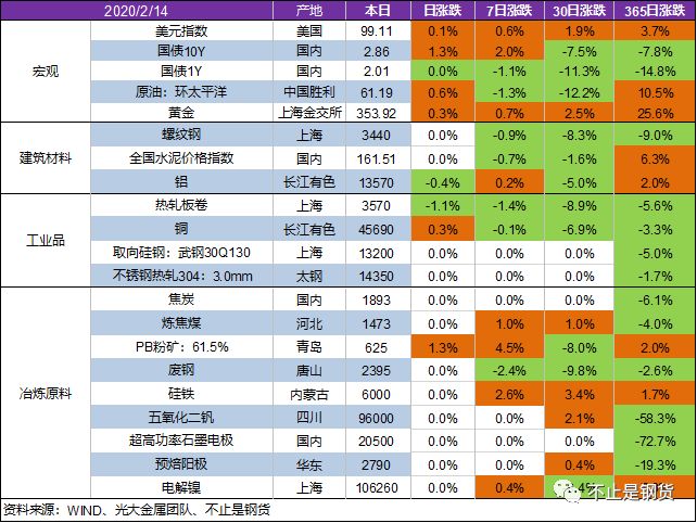 一、钢铁产业链各类品种价格跟踪 2月14日美元指数环比上涨0.1%;十年期国债环比上涨1.3%;一年期国债持平;原油价格环比上涨0.6%;黄金价格环比上涨0.3%;螺纹钢价格3440元/吨,环比持平;热轧板卷环比下跌1.1%;PB粉矿:61.5%环比上涨1.3%;焦炭价格环比持平;全国水泥价格指数持平;废钢价格持平;电解铝价格环比下跌0.4%;电解镍价格环比持平。