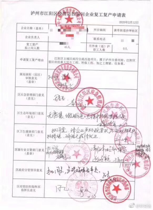 当前,国内更多企业开始复工复产,而相关行政审批环节也被关注。 2月17日,一则《泸州市江阳区疫情防控期间企业复工复产申请表》在网上流传开。这张某企业的复工申请表上,被密密麻麻地盖上了来自环保、应急管理、卫健等多部门8个鲜红的公章。这也引起了不少网友质疑:企业想复工需要来回跑这么多“衙门”反复折腾吗? 17日下午,泸州市江阳区新型冠状肺炎疫情防控指挥部发布了一则《情况说明》对此事进行了回应。说明显示,该企业从提出复工申请,到完成审签备案程序,前后用时不到2天。泸州市江阳区还称,随着当地疫情形势的好转,该区已简化当地企业复工程序,取消了审签备案程序。 就此,《每日经济新闻》记者多方采访来还原此事。 复工审批流程多引质疑,当地部门回应 今日(2月17日)上午,一份复工申请表在网络中流传开,并引起众多议论。 记者注意到,这份来自中七建工集团华贸有限公司(以下简称中七建工)的复工申请表,被密密麻麻地盖上了来自环保、应急管理、卫健等多部门及区政府及疫情防控指挥部等8个鲜红的公章。 图片来源:微博 中七建工复工是因为其承建了泸州市江阳区主城区雨污分流改造项目。而该项目属于泸州市、区的重大民生和环保工程,工期紧、任务重。 “我们复工比较特殊,我们是在疫情比较严重的时候申请的。”一位接近该项目的人士对《每日经济新闻》记者称。 而申请表显示,中七建工该表申请时间是2月12日,而相关部门完成审批则是次日。 泸州江阳区的最新通报对该事缘由也给予了解释。 《情况说明》中称,中七建工是在2月12日下午提出复工申请。2月10日,泸州市江阳区存在7例新冠肺炎确诊病例,形势颇为严峻。为此,泸州市江阳区专门成立了联合工作组,强化对企业复工复产的服务工作。11日下午,联合工作组就到中七建工,现场指导了疫情防控和复工有关工作。12日,该公司按照联合工作组指导意见落实疫情防控措施后,于12日下午5时许提出复工申请。13日,联合工作组通过全程代办的方式对该公司复工完成了审签备案。该公司于当日组织复工。 “据我所了解,目前当地政府是鼓励有条件的企业,在满足相关要求情况下,组织复工的。现在复工,相对没有那么严了。”上述接近该项目的人士称。 而《说明》中进而称,“随着疫情形势的好转,我区取消了审签备案程序,并努力为企业复工复产做好服务。” 复工检查:重点检查员工健康状况等 在取消了审签备案程序后,当地企业复工程序也进一步简化。 “实际上,盖章都在江阳区政府一栋楼内。用不了多少时间,一天之内就可以搞定。”泸州市江阳区经信局有关人士称。 受新冠肺炎疫情影响,目前国内一些中小企业正面临着经营成本上升、用工、现金流等压力,因此,企业的复产复工也显得颇为重要。 “在毫不松懈做好疫情防控的同时,有序做好各类企业复工复产,努力恢复正常生产经营秩序,已成为十分重要和紧迫的任务。”2月14日,四川省经信厅有关人士对《每日经济新闻》记者称。 就此,四川有关部门已强调要“统筹兼顾、创造条件,积极支持企业复工复产,不得用审批备案等方法阻碍企业复工,要最大限度降低疫情对经济社会发展和人民生活的影响”。 “在不影响疫情防控下,是允许企业有序复工的。”泸州市江阳区经信局一位人士也介绍称,当地企业若想复工,先去所属镇街园区递交申请后,应急管理、环保、卫健等部门会上门来检查防控设施等,若相关检查都合格了,交区疫情防控指挥部审定后,便可以复工。 “主要检查员工是否健康,有没有外地来的,防疫措施和设施如何……在疫情这种特殊情况下,还是需要理解。”该人士称,“不能说企业想复工就复工,万一发生疫情,又会有人指责政府不作为。” 当地目前的企业复工情况如何?据四川媒体2月16日报道中称,目前,泸州市江阳区正稳妥有序地,推进企业复工复产。前期,当地经信局联合环保、应急管理、卫健等部门下沉一线走访摸排企业,现已复工复产16家企业,后期将分三批次有序复工,预计江阳区复工工业企业达到75家,占规模以上工业企业的50%。