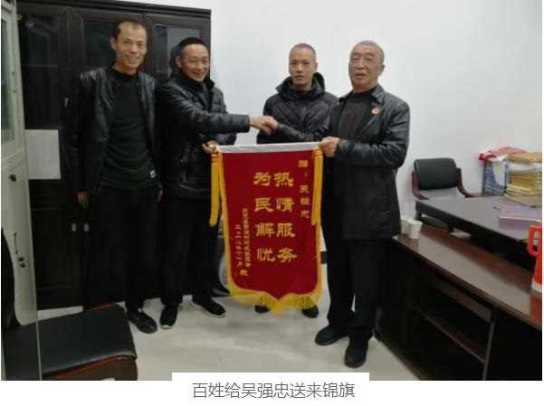还有2019年9月17日,一起经过终审法院判决的调地承包经营权纠纷,当事人奔波6年寻求正义未果,吴强忠从调查、取证、现场勘察用3天时间就彻底处理结束。2020年1月3日,星光村下庄亭自然村因年头洪水冲毁了道路,村民自发浇上水泥路,在浇到水坑盖水泥板时,另一方却不让盖而引发激烈争议,吴强忠即刻赶到现场进行调解,双方心平气和的接受了吴强忠的调解方案,将最后一块水泥板改用粗钢金做成活动板,洪水时可拿掉及清理水沟杂物,平息了一场将一触即发的打架斗殴;2020年1月21日晚上19时始至1月22日零晨时成功调处ー起因浇水泥路导致人身损伤赔偿纠纷……。