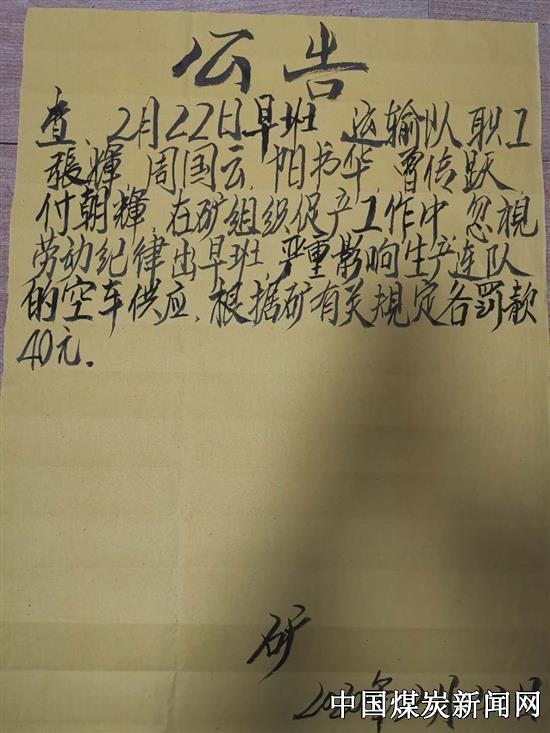 【本网讯】2月22日8:00分,湖南省湘煤集团冷水江市金竹山矿业公司一平硐矿调度室门口公告栏赫然贴着新年第一张黄色的罚款公告,格外引人注目。原来22日早班,运输队职工忽视劳动纪律,提前出了早班,结果导致生产连队空车紧缺,严重影响了全矿原煤产量,被各罚40元。 在加大劳动纪律处罚力度的同时,2月22日至24日,一平硐矿为了鼓舞员工士气,使矿井原煤生产迅速步入正轨,开展了为期三天“战疫情、夺高产”的劳动竞赛。 22日全线飘红,102队计划35吨,4点班完成42吨,超计划7吨,为计划的120%;0点班完成38吨,为计划的109%;104队计划35吨,8点班完成38吨,为计划的109%。共三个班组夺得竞赛奖金。 ![]() “李排长,四点多钟了,溜子别移了,不然我们又要出迟班了”“这怎么行,我们把煤采完了,该我们移的我们就应该移,不然影响下班生产!”“是啊,如果不移,肯定会影响下班生产,做事不能自私,要顾全大局!”。今天排长李伟、刘利星率领全排采了20个顶,出煤42吨,实属不易。该工作面最矮处只有200-300mm,最高也只不过1000mm,平均只有500-600mm,员工只能蹲着采煤,一整天下来大家都腰酸腿疼,都盼着早点下班的心情可以理解,但大家秉承煤矿工人特别能吃苦、特别能战斗的精神,一直做到凌晨一点半,坚持把溜子移好才出班。 战“疫”时刻奖罚分明,充分激励员工在生产中积极性,是一平硐矿力促复工复产的重要“法宝”。现在该矿已恢复三班运转,省内员工已全部返矿,员工出勤率达到90%,原煤生产也回升至春节前水平。