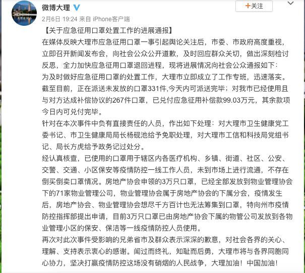 据云南发布24日消息,日前,经云南省委批准,云南省纪委监委对大理市违法扣押征用途经大理的外省(市)防疫口罩问题进行了立案调查。 经查,大理市违法扣押征用防疫口罩问题属实,情节恶劣,性质严重,严重干扰了全国防疫工作大局,严重破坏了防疫工作纪律,严重损害了云南防疫工作形象,充分暴露出大理市委、市政府在紧要关头,无视政治纪律,漠视国家法律,本位主义严重,形式主义、官僚主义问题突出。 措辞十分严厉。 根据通报,8人被问责。 “70后”市委书记 大理市是大理白族自治州州府所在地。此次大理市市委书记、市长、副市长、市纪委书记均在通报之列—— 大理市委书记高志宏:党内严重警告处分、免职 大理市委副书记、市长杜淑敢:撤销党内职务、政务撤职 大理市政府党组成员、副市长娄增辉:撤销党内职务、政务撤职 大理市委常委、常务副市长杨矗:诫勉问责 大理市委常委、市纪委书记、市监委主任张琮:诫勉问责 高志宏,男,汉族,1971年1月生,中央党校研究生学历,中共党员,1993年7月参加工作。 公开资料显示,他的仕途一直在大理。 他历任共青团巍山县委书记,县旅游事业局局长,青华乡党委书记,县发展计划局局长,团州委副书记、州青联副主席,州文化局副局长,州体育局局长,大理州发展和改革委员会党组书记、主任等。 2015年11月,高志宏被提名为云南大理市市长,后任市长、市委书记。 一年前刚被处分 政知君注意到,在一年前,大理市委书记、市长就曾被处分。 在大理,洱海保护是需要关注的要点之一。在大理市政府的官网中有这样一段介绍: 大理市集国家级历史文化名城、风景名胜区、自然保护区于一身的城市,市内设有省级经济开发区和省级旅游度假区。境内苍山洱海珠联璧合,相映成趣。素有“高原明珠”、“东方瑞士”之美誉。 2018年7月,高志宏在接受采访时曾提到,要“抓实洱海保护治理”。 但2019年12月24日,云南省通报中央环境保护督察“回头看”反馈意见问题处理情况。其中,“洱海生态保护工作不力、部分项目推进缓慢问题”在通报之列。 通报提到,根据调查核实情况,给予大理州委、州政府等7个单位问责,给予23名领导干部问责。 其中,大理市委书记高志宏被党内警告处分;大理市市长杜淑敢被政务记大过处分。 根据《中国共产党纪律处分条例》,对党员的纪律处分分为警告;严重警告;撤销党内职务;留党察看;开除党籍。 党员受到警告处分一年内、受到严重警告处分一年半内,不得在党内提升职务和向党外组织推荐担任高于其原任职务的党外职务。 而这次,高志宏、杜淑敢的处分升级。前者被党内严重警告处分、免职处理;后者被撤销党内职务、政务撤职处分。 在大理市政府官网中,杜淑敢的名字已经被删除。 市委书记市长双双道歉 大理市扣留外地口罩一事曾引发外界关注。 事件发生后,大理市委书记高志宏曾表示,向兄弟省市致歉。大理官方称征用的口罩,部分已发放给了疫情一线工作人员,不存在倒卖口罩等情况。 2月6日,大理市官方通报称,对大理卫生健康局局长杨砚池给予免职处理。 当天下午,大理市人民政府新闻办公室举行新闻发布会。在发布会上,市长杜淑敢曾就“截留”口罩一事公开道歉。 “对于前期暂扣口罩一事,我们诚恳地向社会各方表示道歉,对造成的影响进行深深的反思与检讨,对相关人员将进行严肃处理,恳请各方给予谅解。” 不到一月,道歉的市委书记、市长双双上了通报名单。