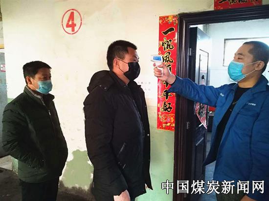 ![]() 王磊在屯兰矿队组楼检测上岗人员体温
