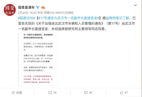 据当地媒体25日报道,应勇去了青郑高速公路武昌收费站、东湖高新武东收费站。他叮嘱大家,持之以恒守牢离汉离鄂通道。应勇强调,毫不放松外防输出,继续实行严格的离汉离鄂通道管控措施,标准不降、力度不减,不麻痹、不厌战、不侥幸、不松劲,坚决阻断疫情蔓延,让党中央和全国人民放心。 如题。 这两天,不少人都注意到了武汉的“第17号通告”和“第18号通告”。 2月24日11时33分,武汉市新冠肺炎疫情防控指挥部发布第17号通告。但这份通告仅仅存在了3个小时。 政知君注意到,2月25日上午,应勇再次到武汉市检查督导离汉离鄂通道管控工作。 武汉一名副市长直接签发 2月24日15时07分,“武汉发布”官方微信发布了武汉市新冠肺炎疫情防控指挥部通告(第18号)。 通告提到,第17号通告“系市指挥部下设的交通防控组未经指挥部研究和主要领导同志同意发布的,现宣布该通告无效”。 通告还提到,对相关人员进行了严肃的批评处理。武汉市“严格离汉通道管理,严格人员管控,严防疫情向外输出”。 24日17时56分,微信公众号“陶然笔记”发布名为《疫情防控通告决不能再朝令夕改》的文章,文中提到: 此次通告是由武汉市一名副市长直接签发,未经指挥部研究和主要领导同志同意。 之后,有官方媒体转发上述文章。24日19时20分,中新社“国是直通车”转发了该篇文章。 湖北省委书记下午开会 政知君注意到,2月24日下午,湖北省委书记、省新冠肺炎疫情防控指挥部指挥长应勇有两场会议: 其一,主持召开专题会,听取支援湖北医疗队代表关于加强疫情防控和医疗救治的意见建议。 其二,主持召开指挥部工作会议,分析湖北省新冠肺炎疫情防控形势,部署下一步防控工作。 省长、省防控指挥部指挥长王晓东也出席了会议。 “疫情防控重在落实,要把各项工作抓紧抓实抓细!”应勇强调,继续严格管控离汉离鄂通道。 需要说明的是,也是在24日,湖北省委常委、武汉市委书记王忠林也开了两场会。 一个是市委常委会会议;一个是视频调度会,研究部署全市养老机构和农村防疫工作。 在市委常委会上,王忠林说,切实把工作抓实抓细,确保政令畅通,落实到位,避免“紧一阵松一阵”。在视频调度会上,他强调,“要严格封控措施,杜绝各类聚集,宣传引导在外务工人员疫情期间不要返村。” 湖北紧急通知:报省指挥部审核 政知君注意到,就在2月24日,湖北省新冠肺炎疫情防控指挥部向全省发出紧急通知。 通知强调,各市、州、县要严格落实属地责任,继续严格执行离汉离鄂通道管控措施,守牢管住离汉离鄂道口,坚决做到内防扩散、外防输出。 通知还提到,“要严格请示报告制度,疫情防控期间,各市州指挥部出台涉及离汉离鄂通道管控有关的政策,须提前报省指挥部审核。” 通知称,要加强督促检查,省指挥部督查专班将各地离汉离鄂通道管控措施执行情况作为重点,加大督办检查力度,对有令不行、有禁不止,打折扣、搞变通等问题,严肃追责问责。 2月25日12时03分,“武汉发布”发布了湖北省疫情防控指挥部的一份通告。 通告提到,滞留在鄂外地人员由当地政府及有关方面提供救助服务,“希望滞留在鄂外地人员遵守现住地疫情防控要求,配合做好相关工作,合力打赢疫情防控阻击战。” 应勇赶赴现场督导 政知君注意到,就在2月25日上午,应勇再次到武汉市检查督导离汉离鄂通道管控工作。 2月20日,他就曾在武汉市检查调研城市封控工作。 据当地媒体25日报道,应勇去了青郑高速公路武昌收费站、东湖高新武东收费站。他叮嘱大家,持之以恒守牢离汉离鄂通道。 应勇强调,毫不放松外防输出,继续实行严格的离汉离鄂通道管控措施,标准不降、力度不减,不麻痹、不厌战、不侥幸、不松劲,坚决阻断疫情蔓延,让党中央和全国人民放心。 “全省各级党委和政府要增强大局意识和全局观念,持续强化离汉离鄂通道管控,只有外防输出,阻断疫情蔓延,其他省区市才能腾出更多资源力量支援武汉、支援湖北,我们才能尽早稳定局势、扭转局势,打好武汉保卫战、湖北保卫战。” 应勇还强调,要继续将疫情防控作为全省头等大事和最重要工作,把离汉离鄂道口守牢,把小区和公共场所管住! 17万人参加的大会 应勇在武汉调研的同时,25日上午,国家卫健委官网发布了《关于依法科学精准做好新冠肺炎疫情防控工作的通知》。 通知明确,“对疫情特别严重的湖北省继续采取最严格的防控措施,已实施交通管控的武汉市和湖北省其他地市,严控人员输出。” 之后,“对湖北继续采取最严格防控措施”也成了不少媒体的标题。 政知君注意到,就在武汉“第17号通告”发布的前一天,2月23日,中央刚刚召开了有史以来规模最大的一场电视电话会议。 这场电视电话会议的主题是“统筹推进新冠肺炎疫情防控和经济社会发展”,这场会议从中央到县团级,共有17万人参加。 在现场,习近平提到抓好几项重点工作,第一个就是坚决打好湖北保卫战、武汉保卫战。他说,“要毫不放松外防输出,继续实行严格的离汉、离鄂通道管控措施。”
