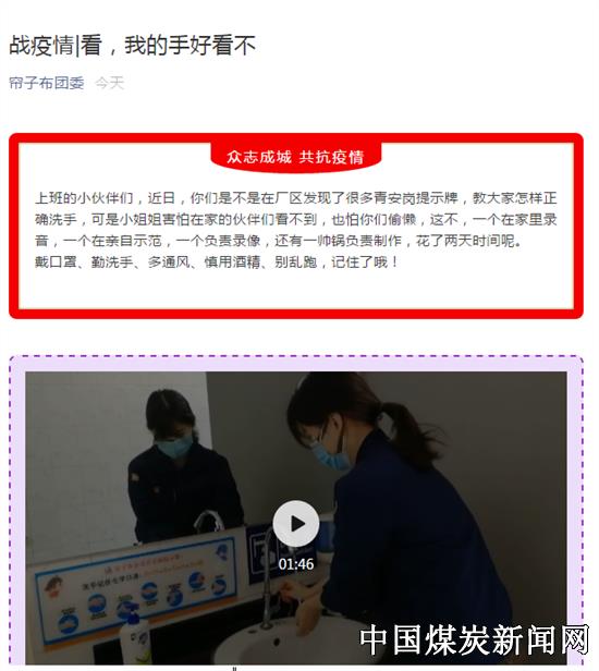2月6日,中国平煤神马集团神马股份帘子布公司团委通过微信公众号推送“七字洗手视频”。虽然已经在厂区贴了很多青安岗提示牌,教大家怎样正确洗手,可是害怕在家的伙伴们看不到。就充分利用资源,一个在家里录音,一个在亲自示范,一个负责录像,还有一帅锅负责制作,花了两天时间完成。
