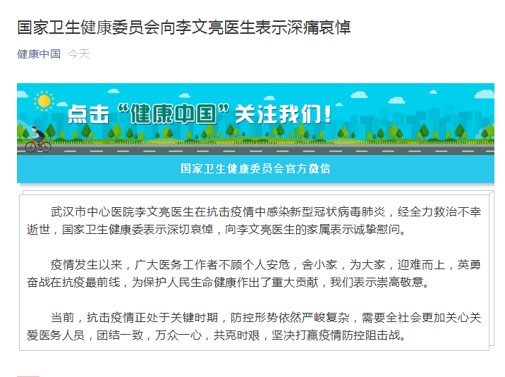 武汉市中心医院李文亮医生在抗击疫情中感染新型冠状病毒肺炎,经全力救治不幸逝世,国家卫生健康委表示深切哀悼,向李文亮医生的家属表示诚挚慰问。