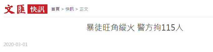 据香港”文汇网““东网”等港媒报道,昨日(2月29日)又有暴徒在旺角闹事,香港警方在警告多次无效后实施驱散、拘捕行动,共拘捕115人。 ![]() 报道称,昨晚暴徒在旺角堵路、纵火,期间车上一位乘客指责暴徒堵路阻碍行程,遭暴徒谩骂、掌掴,被迫向暴徒鞠躬道歉才得以离开,还有警员遭到暴徒以砖头、石头、竹枝等硬物袭击,一度举枪戒备。 报道引述香港警方今天(3月1日)消息表示,昨日傍晚约6时起,有暴徒在旺角警署外集结,之后占据行车线,严重堵塞交通,亦有暴徒用激光笔照射警员、投掷汽油弹、在马路上放置杂物及纵火。警方多次警告无效,采取驱散及拘捕行动。 报道称,警方共拘捕71男44女,年龄介于15至54岁,他们分别涉嫌非法集结、藏有攻击性武器、藏有工具可作非法用途、纵火、袭警、阻碍警务人员执行职务等。案件交由旺角警区刑事调查队及西九龙总区刑事部跟进。全部被捕人士现正被扣留调查。 ![]() 据报道,警方还提到,行动期间,一名警员在弥敦道与奶路臣街交界被多人以砖头、石头、竹枝等硬物及手脚袭击,在生命安全受严重威胁下,拔枪戒备。这名警员头、手、脚受伤,被送往明爱医院治理。另一名警员亦在豉油街及西洋菜南街交界被人以砖头袭击,手受伤,亦被送往明爱医院治理。 香港特区政府发言人今天对此表示,特区政府谴责昨晚有暴徒在旺角一带进行捣乱,破坏社会安宁,严重威胁市民的生命安全。暴徒昨日傍晚开始在弥敦道、太子道西一带聚集,堵塞道路、纵火、破坏公共设施、投掷汽油弹、并以砖头和硬物袭击警务人员,令数名警务人员受伤。警方使用了最低所需武力,进行驱散和拘捕行动,并会严肃跟进这些无法无天的行为,将暴徒绳之于法。