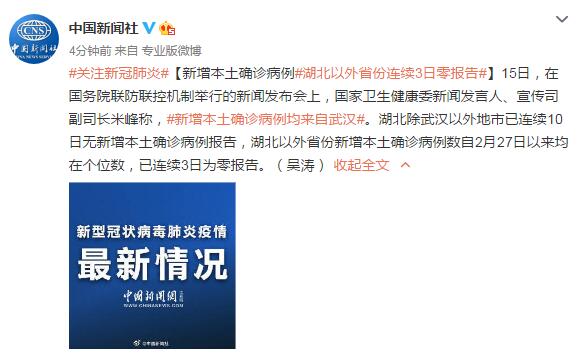 【新增本土确诊病例#湖北以外省份连续3日零报告#】15日,在国务院联防联控机制举行的新闻发布会上,国家卫生健康委新闻发言人、宣传司副司长米峰称,#新增本土确诊病例均来自武汉#。湖北除武汉以外地市已连续10日无新增本土确诊病例报告,湖北以外省份新增本土确诊病例数自2月27日以来均在个位数,已连续3日为零报告。(吴涛)