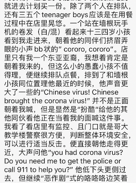 局部出现抢劫 歧视伤害比病毒可怕 相比于需要抢购必需品的紧张感,纽约市民逐渐感受到生活正在面临的新挑战——逐渐显现的次生伤害。 一位华人朋友在朋友圈里分享了自己在街上遭遇遇到十三四岁的小孩当面冲她叫嚷。而这样的情况并非孤例。