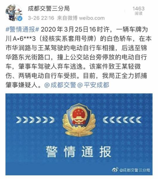 | 成都警方通报肇事逃逸事件:有人受伤 嫌疑人在逃 | |||