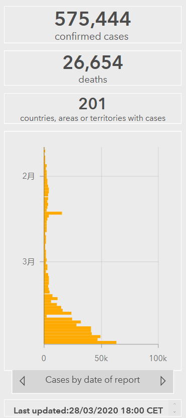 世卫组织数据显示,截至欧洲中部时间3月28日18时(北京时间3月29日1时),全球确诊新冠肺炎575444例,死亡26654例。目前全球已有201个国家地区出现新冠肺炎病例,中国以外新冠肺炎确诊病例超过49万例。 联合国将25万只库存口罩捐给美国 当地时间3月28日,联合国秘书长古特雷斯宣布向其总部所在地纽约的医疗工作者捐献25万只口罩。古特雷斯表示,这部分口罩是联合国的库存一部分,目前存放在纽约,超过了联合国自身需求。古特雷斯希望,这些口罩能为纽约的医疗人员“在挽救生命的过程中,做出微小的贡献”。 美国日新增确诊病例超过2万 据约翰斯·霍普金斯大学数据,截至美东时间28日18时02分,美国新冠肺炎确诊病例为121117例,死亡2010例,日新增病例超过2万例。 美国17个州或地区进入“重大灾难”状态 据美国有线电视新闻网报道,为应对新冠肺炎疫情,截至当地时间28日,美国总统特朗普已经批准17个州或地区进入“重大灾难”,其中包括纽约、华盛顿、加利福尼亚、新泽西、马萨诸塞、密歇根、密苏里、马里兰、伊利诺伊等州。 △工作人员在美国洛杉矶的新型冠状病毒免下车检测站工作 (图片来源:新华社) 纽约州新冠肺炎死亡人数继续攀升 当地时间3月28日,纽约州州长科莫表示,目前纽约州确诊感染新冠肺炎人数已经达到52318人,死亡728人。其中,纽约市新冠肺炎确诊人数已经逼近3万。 科莫宣布,由于新冠肺炎疫情,原定于4月28日在纽约州举行的民主共和两党总统初选推迟到6月23日举行。他预测,纽约州新冠肺炎疫情高峰将在14至21天到来。 洛杉矶市长:新冠疫情可能把加州变成下一个纽约 洛杉矶市长贾西提近日对新冠疫情在加州大面积蔓延提出严峻警告。贾西提认为,现在洛杉矶市的确诊病例数量在不到两天的时间里就增加一倍,如果继续保持这种速度,加州不久将会成为下一个纽约。 截至当地时间3月28日,美国加利福尼亚州新冠肺炎确诊病例4980例,死亡104例。 意大利再次强化入境人员管控 截至当地时间28日18时,意大利新冠肺炎累计确诊92472例,死亡10023例,治愈12384例。 当地时间28日,意大利出台措施:从即日起乘坐各种交通工具的所有入境意大利人员要填写个人声明,说明旅行目的、进行隔离的住址。此外,交通承运方应给入境人员测量体温,提供口罩。 根据意大利此前出台的规定,除停留不超过72小时的工作原因和所属企业注册地址位于意大利境内之外的入境人员,要进行自我隔离14天。而现在,则没有任何例外。 另据意大利媒体报道,目前每天约有2000-2500名意大利人从世界各地回国。 意大利总理孔特宣布抗击疫情社会保障新举措 当地时间3月28日晚,意大利总理孔特在总理府宣布多项抗击疫情的社会保障新举措。 经济方面,政府在现有疫情防控法令基础上向地方市镇政府追加4亿欧元专项拨款,用于帮助经济困难人员购买包括食品在内的生活必需品;设立总额43亿欧元的城市互助基金;有关部门将确保4月15日前,工资保障基金能够发放到位。 关于学校复课和企业复工,孔特明确指出,4月3日之后尚不具备学校复课的条件。目前谈论恢复非必要生产活动也为时尚早。 △意大利总理孔特宣布社会保障新举措 法国总理菲利普:确诊人数每3到4天就会翻倍 据法国卫生部消息称,截至当地时间3月28日,法国新冠肺炎累计病例达37575例,死亡病例在24小时内增加319例,总数达到2314例。 3月28日,法国总理菲利普在政府发布会上称,目前法国疫情发展很快,新冠病毒感染人数每三到四天就会翻倍。法国防疫的战斗刚刚开始,4月的前15天会更加困难。 菲利普强调,法国目前遭遇的是一个世纪以来前所未见的公共卫生危机。为此法国方面采取了限制出行、减少传染、增加重症监护能力、保护一线医护人员等措施。 法国已向中国订购10亿只口罩 据法国媒体3月28日援引法国卫生部消息,为解决法国口罩短缺的情况,法国卫生部已向中国订购总共10亿只口罩。 英国改建成临时医院的伦敦国际会展中心预计下周投入使用 根据英国卫生与社会保健部消息,截至当地时间3月28日9时,英国新冠肺炎确诊病例达17089例,单日新增2510例。目前,伦敦国际会展中心正在被改建成收治新冠肺炎重症患者的临时急诊医院,预计将于下周投入使用。 △改建中的伦敦国际会展中心 另据英国经济大臣阿罗克·夏尔马透露,英国首相鲍里斯·约翰逊目前身体状态良好,3月28日上午还主持了内阁会议。 俄罗斯将从3月30日起关闭所有陆上和水上边境 为了防止新冠肺炎疫情向俄罗斯境内扩散,俄政府总理米舒斯京签署命令,决定从3月30日零时起关闭俄罗斯联邦边境上的所有公路、铁路、徒步、水上和混合类通行检查点,同时关闭俄白两国间的陆路边境。这一命令不适用于俄联邦外交人员,俄外交和领事机构的工作人员,拥有国际驾照的货运司机,轮船和铁路司乘人员等。 从3月29日起关闭国内体育运动基地 俄罗斯体育部28日发表声明,由于受到新冠肺炎疫情的影响,决定从3月29日起关闭国内的体育运动基地,直到发布解除命令为止。 西班牙首相呼吁民众未来两周继续居家办公 当地时间28日,西班牙首相佩德罗·桑切斯宣布从3月30日起两周内民众继续居家办公,除特殊情况外不得私自上街。 希腊应对新冠疫情 大幅延长“出行限制”时间 当地时间3月28日,希腊发展和投资部部长阿佐尼斯·乔治亚季斯表示,当前希腊所