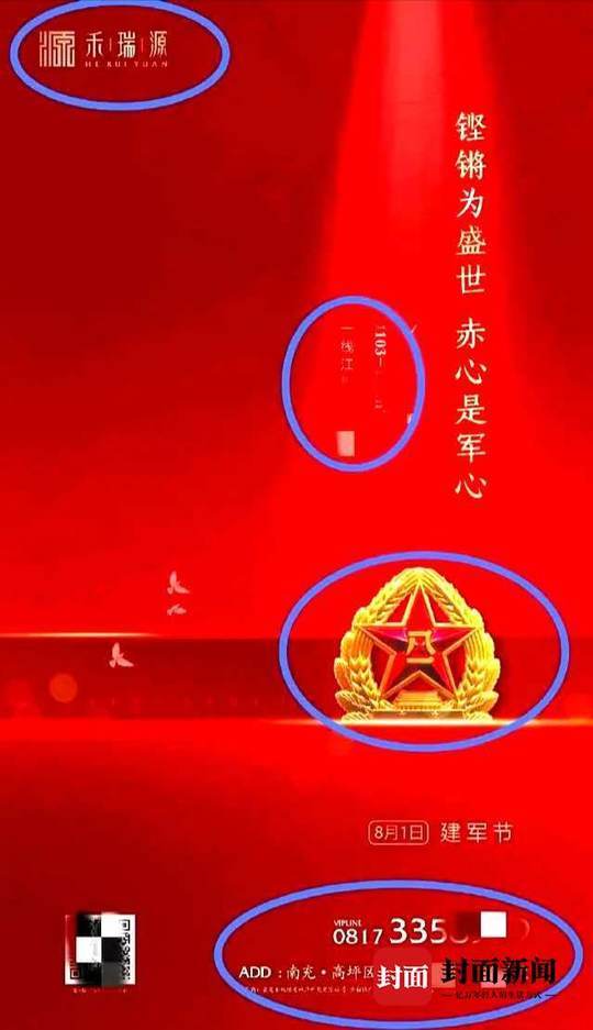 2019年建军节当天,四川南充高坪区下中坝“禾瑞源”楼盘,在员工微信朋友圈发布促销广告,红色海报上,八一军徽闪闪发光。3月29日,封面新闻记者获悉,开发商违现发布广告被南充市高坪区市场监督管理局处罚款12万元。 调查查明,“禾瑞源”楼盘使用的含有八一军徽的宣传海报,系成都某广告设计公司设计,2019年7月31日,设计公司通过微信将广告图片发送到“南充禾瑞源项目”,供当事人宣传使用。设计公司发送了两张八一建军节的宣传广告图片,一张灰色一张红色。楼盘项目销售经理选定红色含有军徽宣传图片,发送到“禾瑞源营销部”的工作群,供工作人员在各自的朋友圈宣传使用。 市管部门认为,楼盘发布含有军徽的广告的行为,违反了《中华人民共和国广告法》第九条第一款第(一)项“广告不得有下列情形:(一)使用或者变相使用中华人民共和国的国旗、国歌、国徽,军旗、军歌、军徽 ”的规定,高坪区市场监管局对当事人处以罚款12万元。