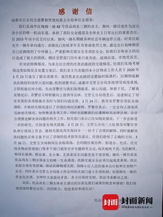 封面新闻记者 宋潇 4月10日,记者从成都交警五分局了解到,此前针对成华区“优品尚东三期”门前的消防通道大整治行动,收到了良好效果。 原来,就在上个月28日早上,一则消息和几张街景图在成华区“优品尚东三期”小区业主群里炸开了锅,“门口的路通了!”“通道上一台乱停的车子都没有了!”该小区门前一条不到300米的进出通道,终于通了。 “断头路”长期不通 王先生是“优品尚东三期”第一批业主,对这几年的出行之苦深有体会。该小区东临成绵乐城际铁路,南靠杨柳工业园区,西邻“优品尚东一期”居住区,几个方向都是“断头路”。 御风一路是进出小区的唯一通道,更是消防进出通道,而这条“生命通道”却长期被各种肆意乱停车辆“霸占”,这一“顽疾”困扰着小区居民。 据了解,“优品尚东三期”小区住户加商铺共计1040户,配套地下停车位968个,实际停放547个,空余421个。 部分小区业主因不愿交纳停车费或图方便,觉得门口的御风一路就是一处“天然停车场”,小区物业屡次劝阻,属地民警巡查管控,乱停乱放现象确仍时有发生。 车辆乱停乱放屡见不鲜 疫情期间,这种乱停现象更有升级之势。 针对这一情况,从3月26日开始,成都交警五分局牵头组织万年场街道办、辖区派出所、城管大队、槐树店社区相关人员,由分局领导亲自带队,深入实地,与小区物业和业主代表召开现场会,倾听民声,谋划对策,当场安排一名社区交警,专人专抓,长期负责。 并与物管、业主建立推动整治微信工作群,加强信息互通,延伸交通、治安建议和政策推送渠道;建立由交警、综治办、城管、社区、物管组成的工作小组,形成“共治”机制。 属地民警对长时间停放、占用消防通道机动车通过电话联系车主主动驶离,确无法联系到车主的,一律拖移原地,御风一路段实行属地勤务大队“包干负责、定人定岗”管控,每日安排警力加强此路段巡逻管控,强化整治机动车乱停放。 其次,交警对御风一路段施划全新标线,在通道进出两端设置交通诱导标牌,在道路中间增设隔离护栏;联系共享汽车公司,将长年停放此处的共享汽车挪走,告知将共享汽车泊车点位另设他处;利用小区内的宣传展板和业主微信群将“禁停”信息广而告之,做到人人知晓,倡导人人遵守;每日上下班高峰期:交警值守,指挥疏导车辆有序通行;平峰期间:城管、物业分别派出专人值守,劝导乱停放车辆。 3月30日,“优品尚东三期”小区业主代表,带着锦旗和感谢信,来到交警五分局,当面表达谢意。