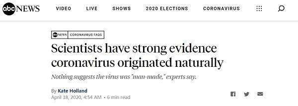 美国广播公司网站报道截图 据美国广播公司网站4月18日报道,科学家有强有力的证据证明新型冠状病毒是自然形成的,没有任何迹象表明这种病毒是“人为的”。 文章称,特朗普政府一直在散播消息,称“病毒起源于武汉实验室”。但是,美国科学家越来越坚信,这种病毒是自然产生的。 美国斯坦福医学院传染病学教授罗伯特•谢弗强调: “没有理由相信病毒是实验室制造的。自然界中有许多菌株可能导致这种类型的病毒暴发。” 斯坦福医学院疾病预防教授约翰•恩尼蒂斯也表示,新冠病毒没有以任何方式表现或看起来是合成的。 他说: “从病毒自身和与受体结合的方式来看,它们不像是任何人类操纵的东西。” “如果是人造病毒,不会是这个样子。”恩尼蒂斯教授表示,他的结论非常肯定。 “在我看来,毫无疑问这种病毒不是在实验室中创造出来的。”