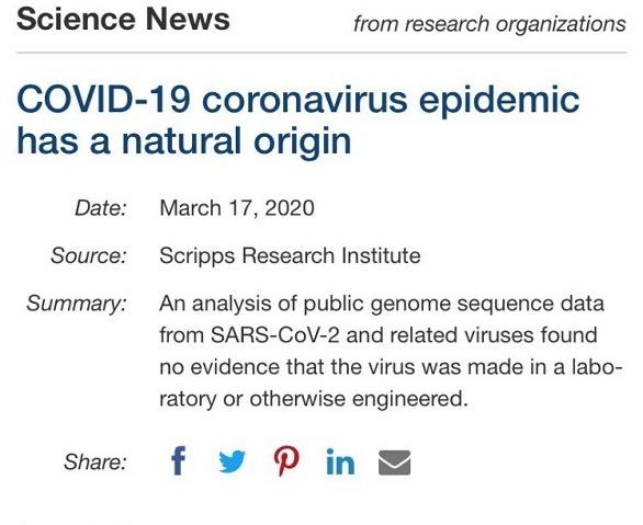 美国《科学日报》文章截图 美国《科学日报》近期也报道,一项对新型冠状病毒及相关病毒的公共基因序列的分析表明:没有证据显示该病毒是实验室制造、或以其他人为方式设计的。 美国斯克里普斯研究所免疫学及微观生物学助理教授克里斯蒂安•安德森表示:“在对比了可用的冠状病毒菌株的公共基因序列数据后,我们很肯定地确认,新型冠状病毒是来自自然界的。”
