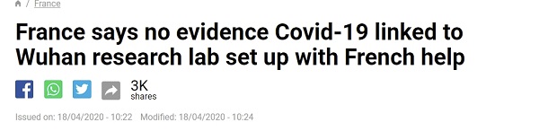 法国24电视台报道截图 另据法国24电视台报道称,法国总统府办公室一名官员17日表示:“我们在此澄清,迄今为止,没有事实证据可证实近期在美国媒体流传的消息,即新型冠状病毒源头与中国武汉P4实验室的研究工作有关联。” 法国免疫学家、新冠疫情科学委员会负责人让—弗朗索瓦·德尔弗雷西也明确表示,新冠病毒源自实验室的假设是“一种不属于真正科学范畴的阴谋论观点”。