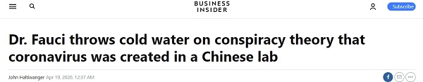 商业内幕网站报道截图 美国商业内幕网站报道的标题则更为直接,福奇给“新冠病毒源自中国实验室”的阴谋论泼了一盆冷水。 文章称,有美国“抗疫队长”之称的美国顶级传染病学专家福奇表示,关于病毒起源的现有证据表明“目前新冠病毒的突变与某物种将病毒从动物身上传递给人类的过程完全吻合”,驳斥了新型冠状病毒是在中国实验室制造出来的阴谋论。 福奇强调,对病毒基因组的研究有力地表明,病毒是从动物传染给人类的,而不是在实验室环境中创造的。 文章还特别强调,尽管缺乏证据,总统偏爱的福克斯新闻频道在过去一周里一直在努力推动“病毒来自中国实验室”阴谋论。