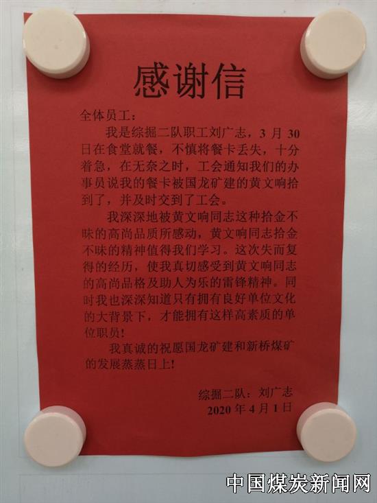 4月2日上午,永煤集团新桥煤矿职工餐厅公告栏前面,站满了人员,笔者看到一封流露着热情洋溢、带着满满正能量,表扬河南能源建设集团国龙矿建公司新桥项目部新桥工地开二队职工黄文响拾金不昧精神的感谢信,受到大家的一片夸赞。 ![]() 原来,3月30日下午上中班的职工黄文响下了通勤车,来到食堂买过饭后,发现餐桌下面有一张餐卡,他立即捡了起来。随后,他和项目部工作人员一同交给矿工会办公室工作人员,在矿上服务公司查询后,得知此餐卡上有642元。而在矿工会工作人员询问他的姓名时,职工黄文响却笑着离开了。丢失饭卡的新桥煤矿综掘二队职工刘广志领到失而复得的饭卡时,激动的不知说什么才好,多方打听,才知道是建设集团国龙矿建公司新桥项目部职工黄文响做的好事,为了表示感谢,他把一封发自肺腑的感谢信贴于矿职工餐厅。 黄文响同志这种拾金不昧的精神,充分表现出了一名普通职工的高尚品质和良好的社会公德,也是河南能源人的骄傲,我倡议大家向他学习,为集团公司的蓬勃发展再立新功。