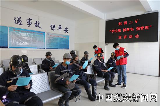 五四青年节来临之际,河南能源焦煤公司赵固二矿团委结合“学法规、抓落实、强管理”活动,组织青年志愿者深入基层区队、班组、副井口开展学法规宣讲活动,引导广大职工自觉学习安全生产法律法规、规章制度和企业安全文化等知识,提高岗位操作技能,为矿井安全发展贡献力量。图为活动现场。