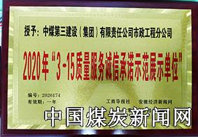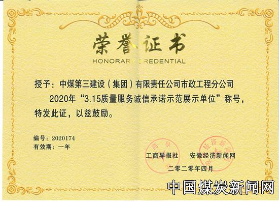 | 诚信为本 再创佳绩 ---中煤三建市政工程公司荣获2020年“3.15质量服务诚信承诺 示范展示单位” | |||