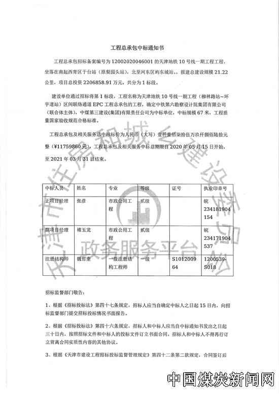 【本网讯】日前,从天津市住房和城乡建设委员会政务服务平台获悉,中煤三建市政工程公司成功中标天津地铁10号线一期工程(柳林路站~环宇道站)区间联络通道EPC工程。