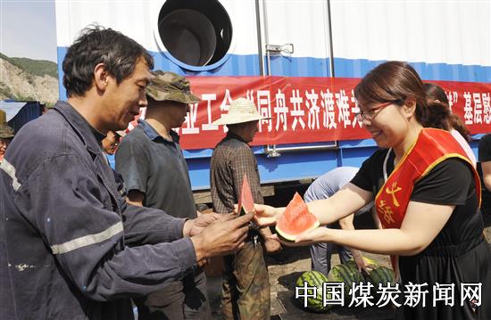 连日来,气温持续升高,义络煤业参与风选厂升级改造施工的职工们在户外进行着连续作业。为保障他们的身体健康、以更好的精神状态投入到紧张的工作中,5月21日,义络煤业工会组织开展“同舟共济渡难关 扭亏增盈做贡献”基层慰问活动,在为职工们送去矿泉水、西瓜等慰问品的同时,也送去了浓浓的企业关怀。图为义络煤业风选厂职工。