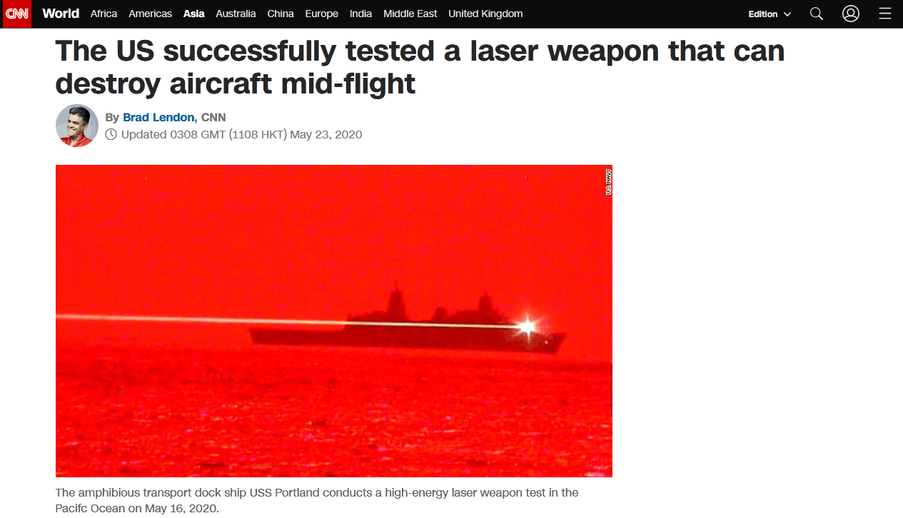 据美国有线电视新闻网(CNN)消息,当地时间5月22日,美国太平洋舰队在一份声明中称,一艘美国海军军舰成功测试了一款新型的高能激光武器,这种武器能够摧毁飞行中的飞机。