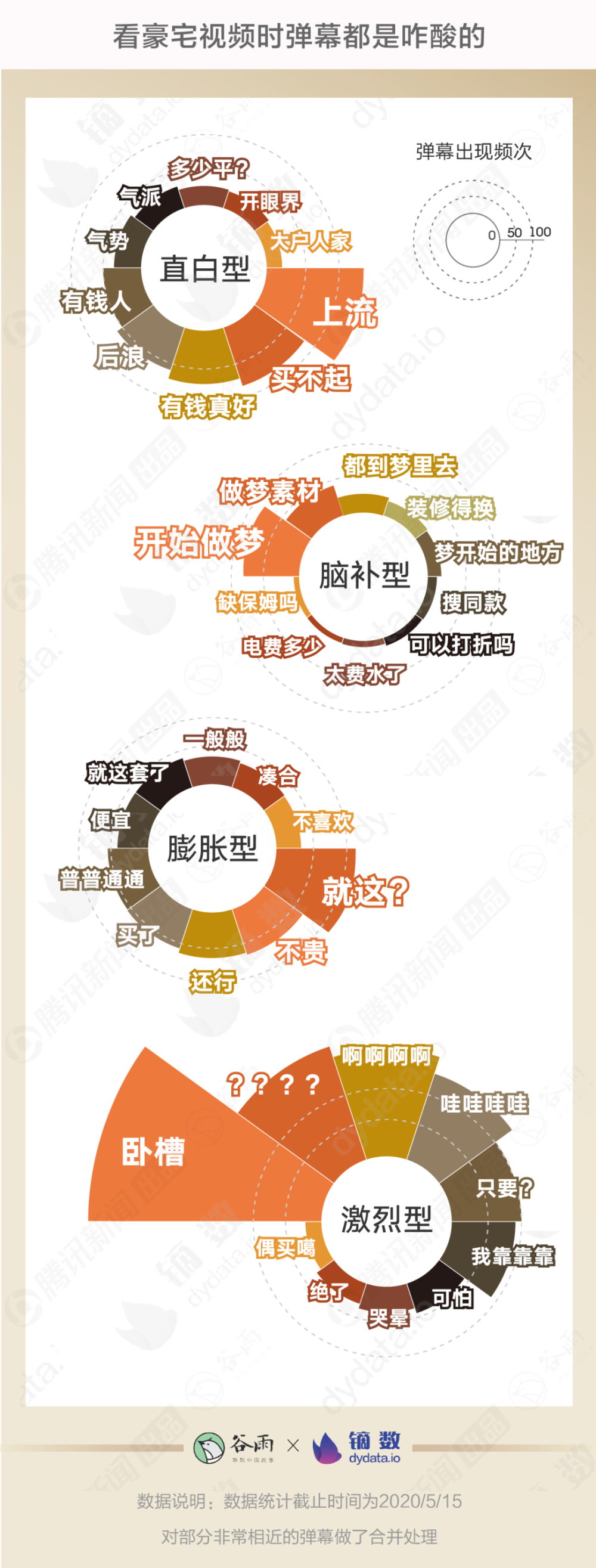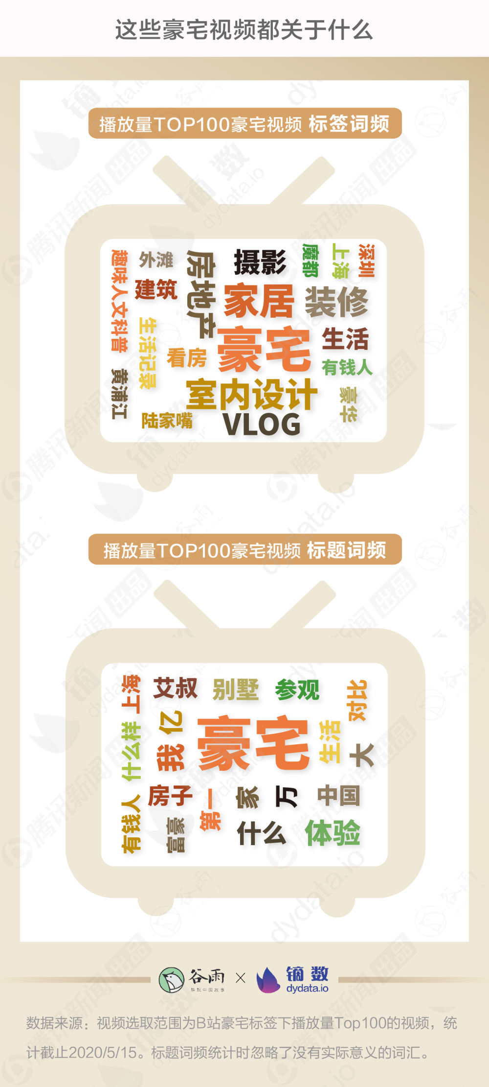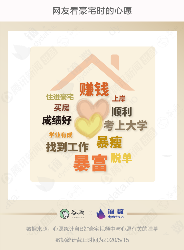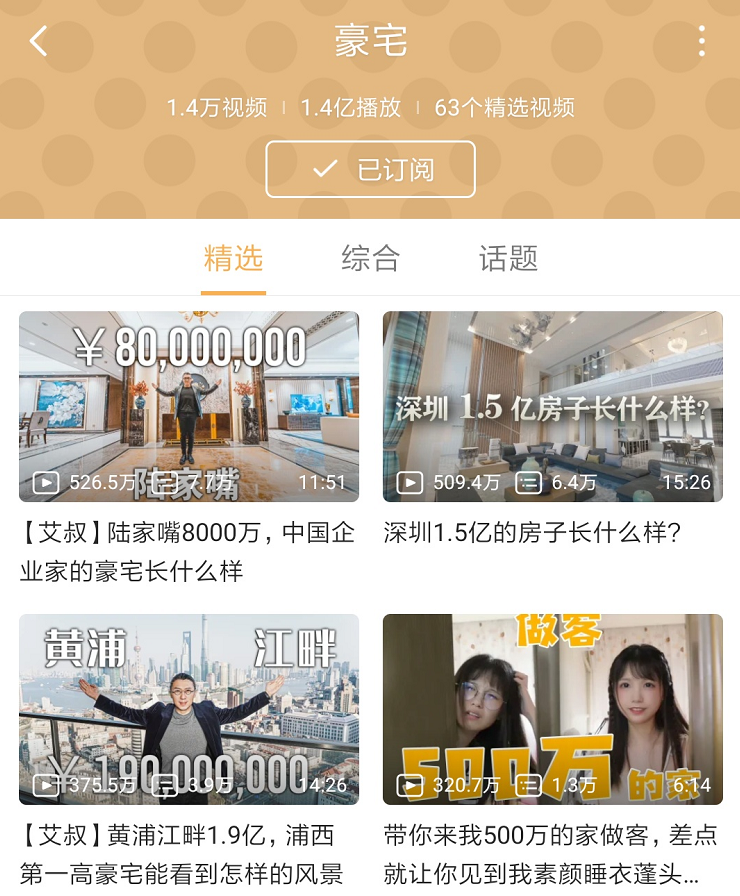 出品丨腾讯新闻谷雨工作室 “30岁在外滩拥有一套5000万豪宅是怎样的体验?” “95后女生独居!带你参观上海汤臣一品1.2亿豪宅” 在B站,有一个“豪宅”频道,汇聚了1.4万多条带有“豪宅”标签的视频,截至目前已累计1.4亿次播放。其中近30天投稿的就有5个超过了百万播放,个个都能轻松跻身每日热门视频榜。 推开豪宅频道的大门,满眼都是不可自拔的年轻人。在看遍火爆的豪宅视频后,谷雨数据试图打探这些把“在线看豪宅”当作睡前必修课的年轻人心里是怎么想的。 豪宅频道都有啥 在采集了B站播放量最高的100个豪宅视频之后,能看出这些视频有一些共同特点。 首先,标题中房价的“天文数字”是必备。一个在普通人眼里近乎遥不可及的价格可以最直接地体现“豪”。 其次,夸张的设计才能在众多的豪宅中脱颖而出。比如,一个可以晨跑的阳台,或者一个层高超7米的大客厅,极富视觉冲击力的画面震呆一众网友。