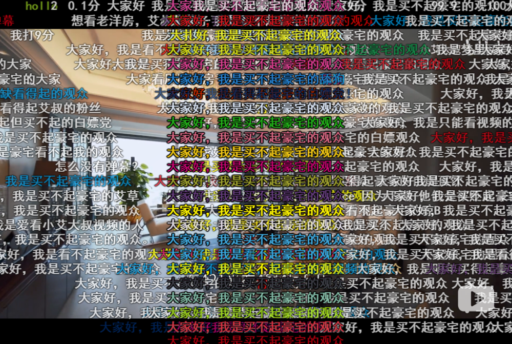“就这?”“不买!” 这种默契还体现在一类弹幕上,那就是各种理由的“不买”。 艾叔在视频里展示豪宅广阔无遮挡的顶级视野,“哪怕稍微有一点点遮挡,稍微差一点点角度,都不能算顶级。”弹幕给出的回复是:“恐高,不买”。