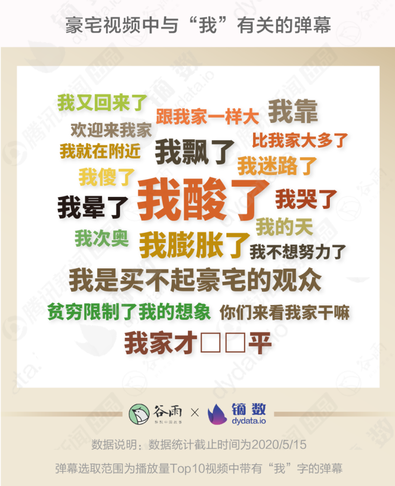 豪宅视频是“柠檬精”大型表演现场 看豪宅视频的另一大乐趣,是点开弹幕,欣赏B站“柠檬精”的表演。播放量Top10豪宅视频中的近2万条弹幕,暴露了各位“柠檬精”们。 各种姿势地“酸” “酸”,可分为四大主流。 第一类属于“直白型”,直接喊出“上流”、“有钱真好”,或者来一句“后浪”,表示这种富有的人生才是真“后浪”。 另一类“脑补型”,把豪宅当做“做梦素材”,或者脑补自己是豪宅的主人,担忧起水费、电费、物业费。 “膨胀型”更是堪称一绝。这种观众多半是从5千万、8千万一路看到2个亿。一句“就这?”是这类弹幕的集大成者。 弹幕数量最多,情绪也最浓烈的要数“激烈型”。 “卧槽”、“???”、“啊啊啊啊”这些简单的字眼跟符号,背后是一双双惊疑不定的小眼睛、一颗颗剧烈波动的小心脏。 除了这几类弹幕,豪宅视频中还总会固定地出现大量有专属特色的弹幕。 每当小艾大叔念出开场白“大家好,我是看得起豪宅的艾叔”,一瞬间“大家好,我是买不起豪宅的观众”糊满屏幕。 这种小默契,传达出此刻同看豪宅的“自己人”。