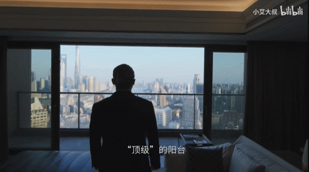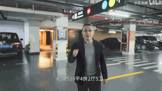 无论是从这些视频的标签还是标题来看,“家居”“生活”“体验”“有钱人”等关键词都在透露它们吸引观众的核心要素——在线看豪宅,脑补有钱人的生活乐趣。 再聚焦到播放量TOP10的视频。 从视频作者来看,“小艾大叔”包揽了播放量前10视频中的6个,可谓撑起了B站豪宅频道的半壁江山。 “小艾大叔”跟“爱探宅”,都是只专注于豪宅探访的UP主,在现实中均是专业的房地产从业者。 下图就是艾叔从停车场开始介绍上海市中心的浦西第一高豪宅,“价值1.9个亿,首付只要5700万”,那口吻就像在介绍3千块一个月的房子。