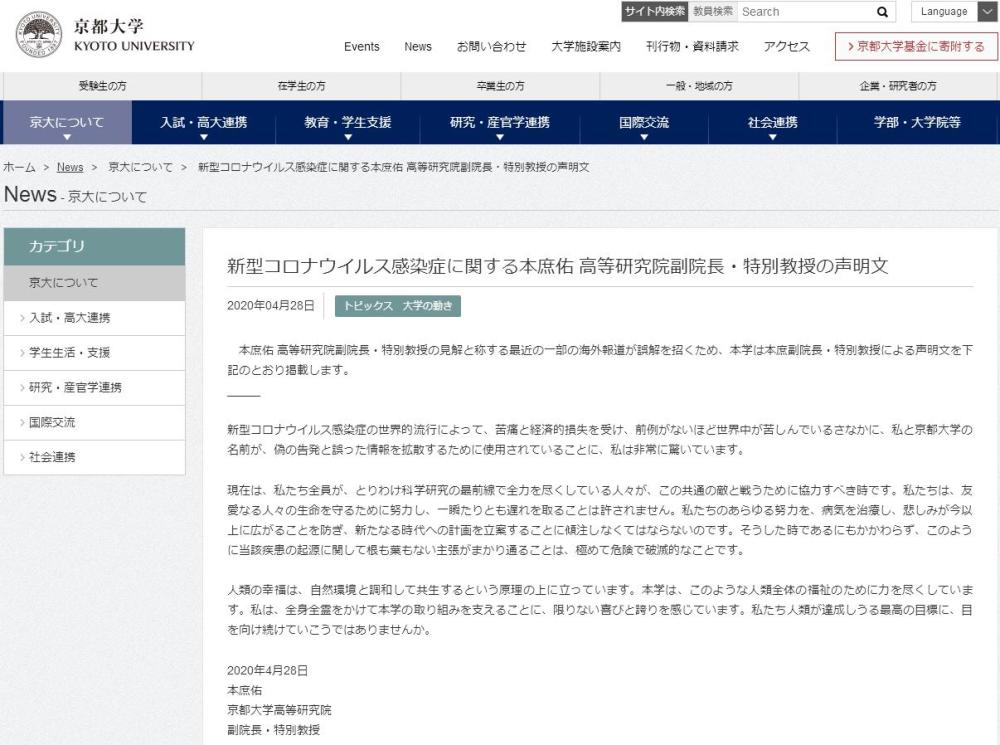 据日本媒体报道,有人假借本庶佑之名通过英语、印地语等语言传播“新冠病毒是人工制造的”等虚假消息,甚至恶意杜撰本庶佑具有曾在武汉工作的经历。 对此,本庶佑和京都大学的声明如下: “本庶佑高等研究院副院长、特别教授认为,由于最近的一些海外报道引起误解,本庶副院长、特别教授的声明文如下所述: 因为新冠肺炎在世界范围内流行,造成的痛苦和经济损失,史无前例。当下全世界都经历痛苦之时,我和京都大学的名字,被用于进行虚假发布和错误信息的扩散,让我感到非常惊讶。 现在,是我们所有人,特别是在科学研究最前线的人竭尽全力的人们,为了和这个共同敌人战斗而应该合作的时候。我们为保护友爱的人们的生命而努力,一刻也不能延迟。我们所有的努力都必须倾注于治疗疾病,防止悲伤进一步扩散,制订面向新时代的计划。在这种情况下,像这样对疾病的起源毫无根据的主张,是极其危险和具有毁灭性的。 人类的幸福建立在与自然环境和谐共生的原理之上。本校为了这样的人类全体的福祉而尽力。我为全身心地支持本校的工作而感到无比的高兴和自豪。让我们继续朝着我们人类能够达成的最高目标前进吧。”