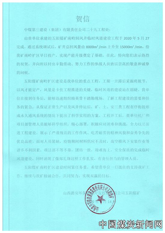 6月14日,山西潞安环保能源开发股份有限公司五阳煤矿向中煤三建二十九工程处发来贺信,祝贺该处承建的五阳煤矿南岭回风井临时风道建设工程于2020年5月27日顺利完成。