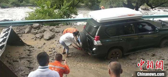 救援人员正在帮助受困车辆脱险。丹巴宣提供 目前,丹巴县正组织全体干部和群众积极展开自救,并全力开展抗洪抢险救援工作。(完)