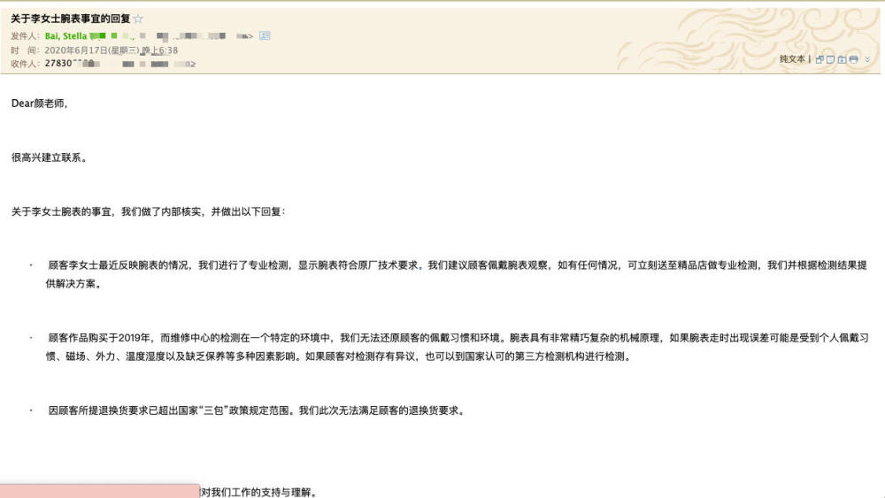 6月17日,红星新闻报道了成都人李女士花3.9万元购买卡地亚手表,一年内送修三次一事。红星新闻发稿后1小时不到,卡地亚中国公关公司客户总监Stella Bai联系上红星新闻记者,并通过邮件回复李女士一事。(此前报道:3.9万买的卡地亚手表一年送修3次 卡地亚检测:符合原厂技术要求) 回复如下: “顾客李女士最近反映腕表的情况,我们进行了专业检测,显示腕表符合原厂技术要求。我们建议顾客佩戴腕表观察,如有任何情况,可立刻送至精品店做专业检测,我们根据检测结果提供解决方案。 顾客作品购买于2019年,而维修中心的检测在一个特定的环境中,我们无法还原顾客的佩戴习惯和环境。腕表具有非常精巧复杂的机械原理,如果腕表走时出现误差可能是受到个人佩戴习惯、磁场、外力、温度湿度以及缺乏保养等多种因素影响。如果顾客对检测存有异议,也可以到国家认可的第三方检测机构进行检测。 因顾客所提退换货要求已超出国家‘三包’政策规定范围。我们此次无法满足顾客的退换货要求。” 卡地亚邮件回复截图 此前,李女士告诉红星新闻,希望可以按三包法,退款或换新。而钟表在实施三包的第一批商品目录中,有效期为整机一年。李女士于2019年5月19日购买的此表。