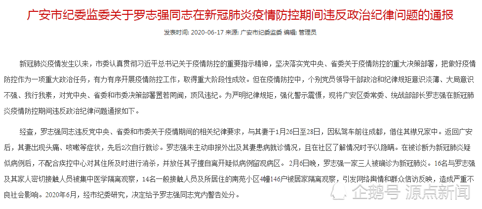 今年1月疫情期间,四川广安市广安区委常委、统战部部长罗志强驾车外出,并隐瞒出行情况,后来一家3口被确认为新冠肺炎,导致所住小区146户被居家隔离观察。6月17日,广安市广安区纪委监委官网称,罗志强受到党内警告处分。 6月17日,该官网登载的《广安市纪委监委关于罗志强同志在新冠肺炎疫情防控期间违反政治纪律问题的通报》称,经查,罗志强同志违反党中央、省委和市委关于疫情期间的相关纪律要求,与其妻于1月26日至28日,因私驾车前往成都,借住其襟兄家中。 返回广安后,其妻出现头痛、咳嗽等症状,先后2次自行就诊。罗志强未主动申报外出及其妻患病就诊情况,且在社区了解情况时予以隐瞒。 在被诊断为新冠肺炎疑似病例后,不配合疾控中心对其住所及时进行消杀,并放任其子擅自离开疑似病例留观病区。 2月6日晚,罗志强一家三人被确诊为新冠肺炎。16名与罗志强及其家人密切接触人员被集中医学隔离观察,14名一般接触人员及所居住的南苑小区4幢146户被居家隔离观察,引发网络舆情和群众信访反映,造成严重不良社会影响。2020年6月,广安市纪委研究,决定给予罗志强同志党内警告处分。